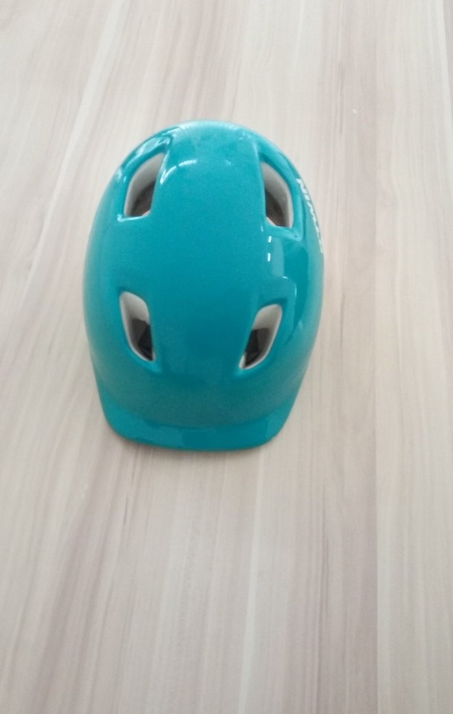 Plastik malzemeden yapılmış, parlak mavi renkte, minimal ve sade tasarımlı kask. Havalandırma delikleri ve renkli, pürüzsüz yüzeye sahiptir. ️