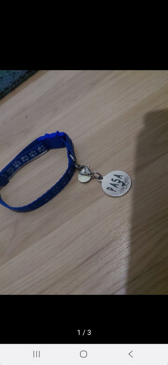 Parlak mavi renkli, pati desenli kedi tasması ve "PAŞA" yazılı metal isimlik içerir.