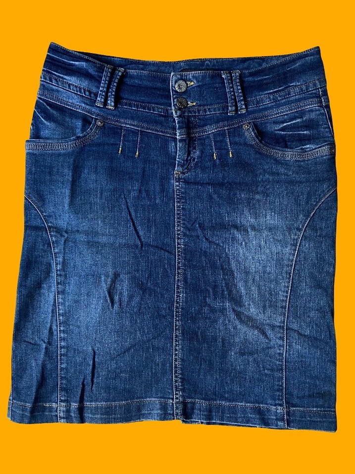 Parlak mavi renkte, kemerli ve dar kesim denim mini etek. Normal boyda, günlük kullanım için uygundur.
