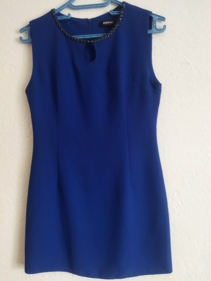 Parlak mavi renkte, kemerli ve V yakalı, kolsuz, vücuda oturan midi elbise. Ofis ve günlük şık kombinlere uygun. ✨