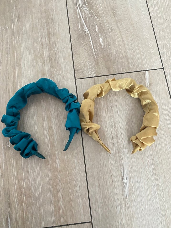 Parlak mavi keten lastikli saç bandı, bohem tarzda ve avangart görünüme uygun. Eşsiz buruşuk dokusu ve 'A' detayı bulunur. ✨