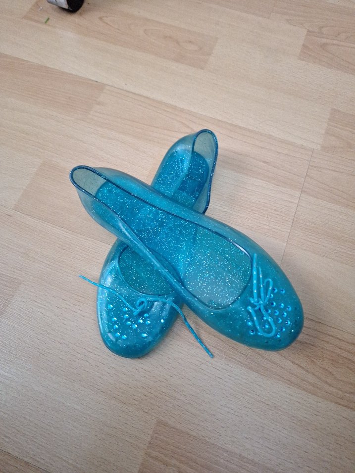 Parlak sim detaylı, esnek kauçuk malzemeden yapılmış mavi kız babet ayakkabı, renkli ve şık görünüme sahip.