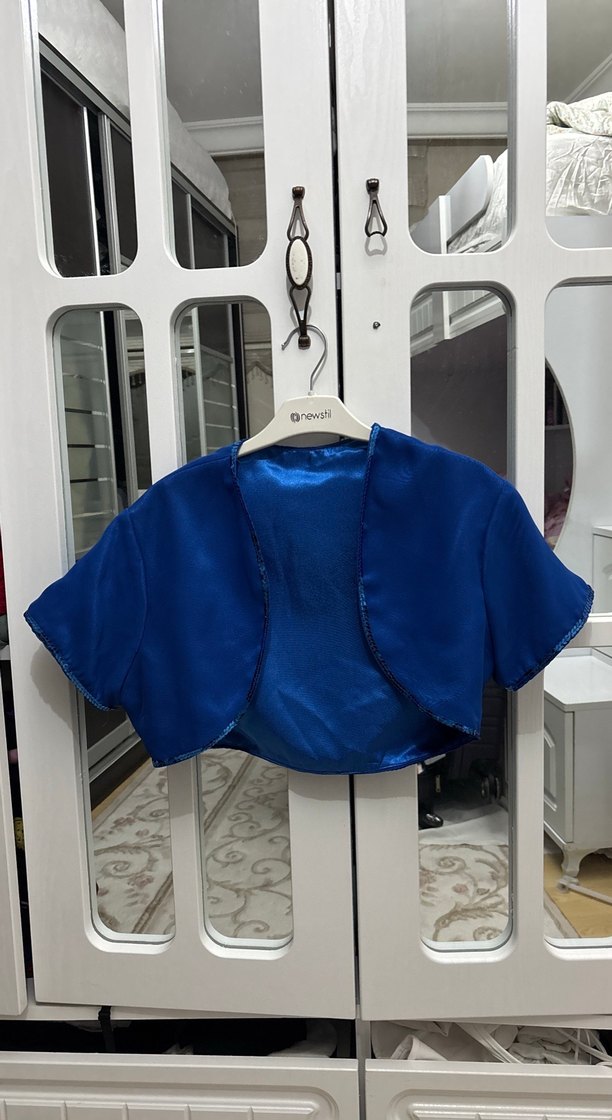 Parlak mavi sentetik kumaştan, kısa kollu, straplez yaka ve düğmeli kız bolero. Fitted kesimiyle sokak modasına uyum sağlar. ✨ özel dikim
