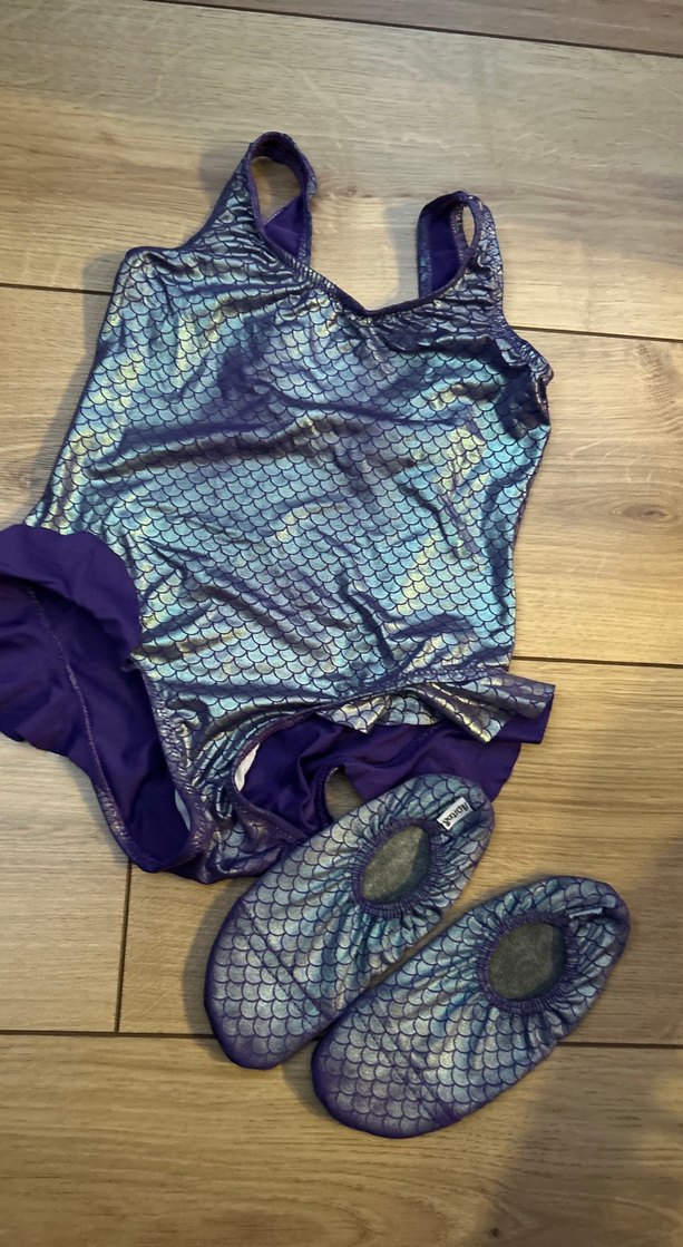 Parlak mavi, pul desenli kız çocuk mayosu, ince askılı ve uyumlu yumuşak yüzme ayakkabıları ile birlikte günlük kullanım için uygundur.
