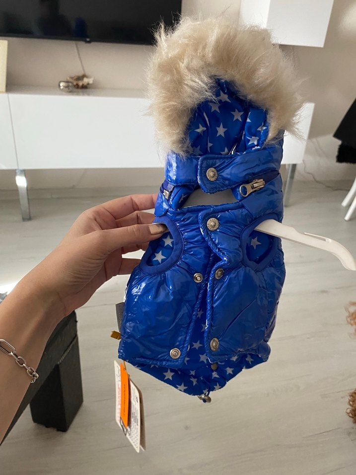Parlak mavi renkte, yıldız desenli ve kürklü kapüşonlu sokak stili köpek montu.