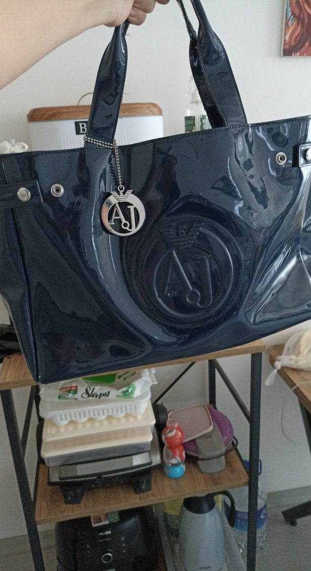 Parlak mavi plastikten yapılmış, tokalı ve kabartma logolu kadın omuz çantası, günlük kullanıma ve sokak modasına uygun. metal Armani jeans çanta aksesuari da mevcut alt tabanda minik soyulma var ama hiç farkedilmiyor kaldırıp havaya altına bakmak gerek sorun teşkil etmez