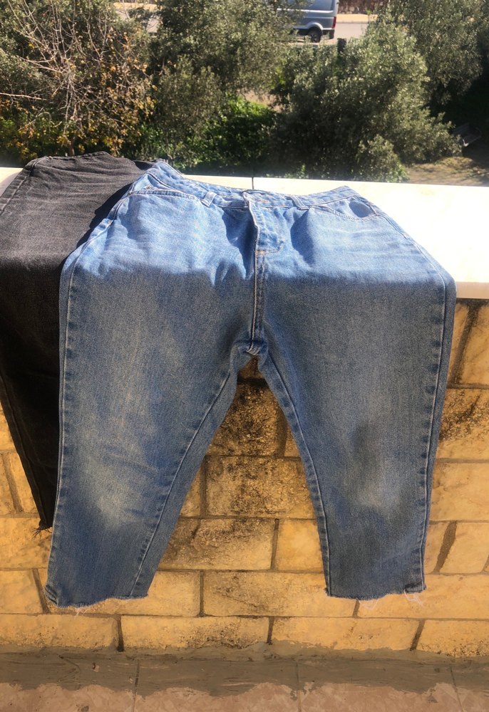 Parlak mavi denimden yapılmış, midi boy ve bol kesim kadın jean, rahat sokak stili ve dış mekan kullanımı için uygundur.