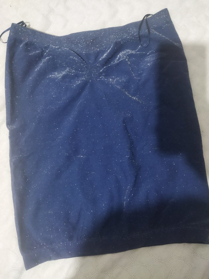 Parlak mavi sentetik kumaştan, drapeli ve midi boyda, minimal tarzda, kadın kalem etek. Romantik akşamlar için uygun.
