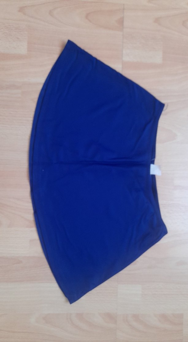 Parlak mavi renkte, midi boy ve bol kesim hamile eteği. Düz sentetik kumaştan, spor ve günlük kullanım için rahat ve şık.