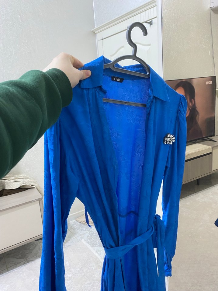 Uzun kollu, yaka detaylı ve parlak mavi renkte, midi boy, belden kuşaklı,. Desenli şık model