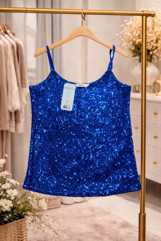 Parlak mavi simlerle kaplı, askılı, kısa ve bol kesim mini bluz, sentetik kumaştan, parti için uygun. ✨