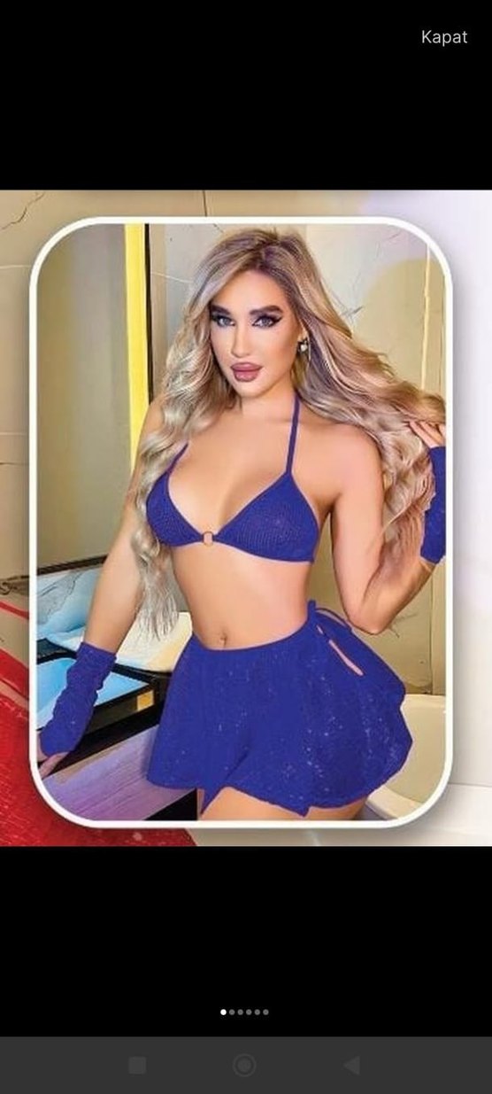 Parlak mavi renkte, dantelli ve kısa mini etekli, ince askılı kadın bikini takımı. Parti için uygundur.