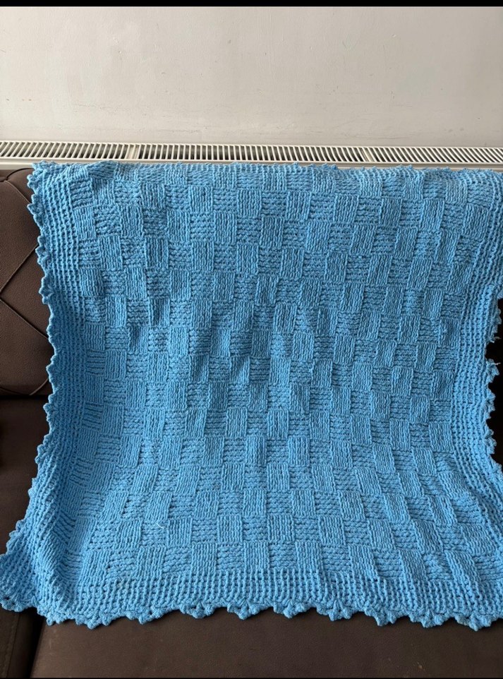 Parlak mavi renkte, yumuşak örgü çocuk battaniyesi, hafif dokulu tasarım ve dalgalı kenarlarla.