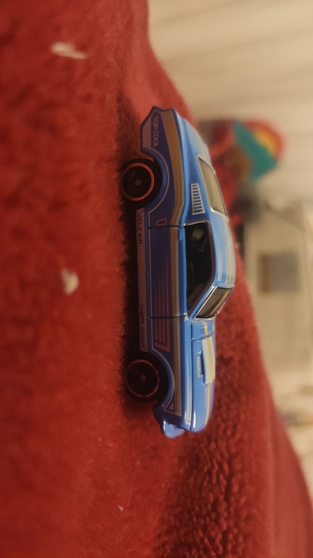 Parlak mavi renkte oyuncak araba, detaylı tasarıma ve pürüzsüz tekerleklere sahiptir. Markası metal machines