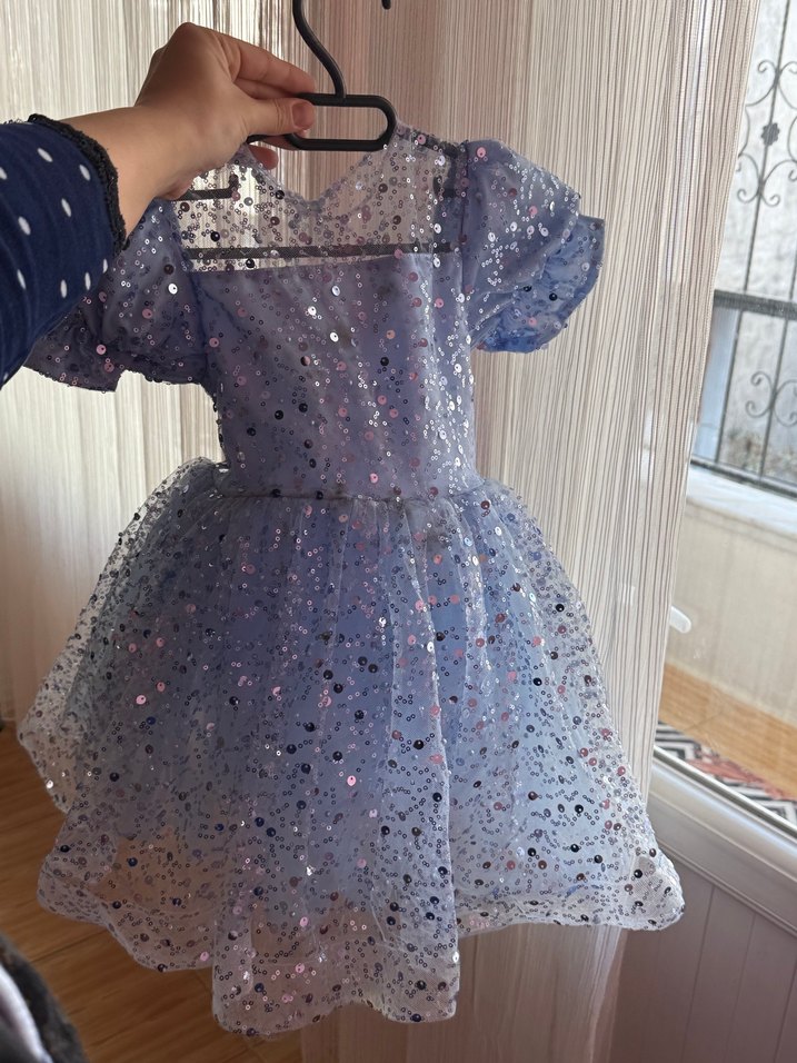 Parlak mavi sentetik kumaştan, payet ve nakış detaylı, V yakalı ve askılı, vücuda oturan çocuk elbisesi. ✨
