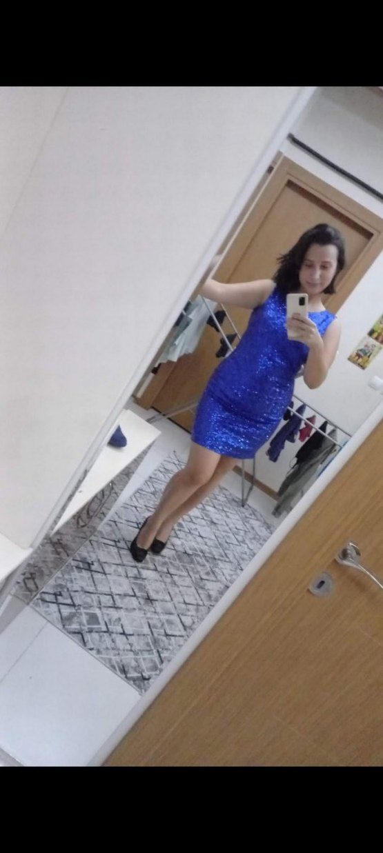 Parlak mavi kumaştan, payet detaylı, yılan desenli, askısız ve kolsuz mini elbise. Gösterişli davetler için uygun. ✨