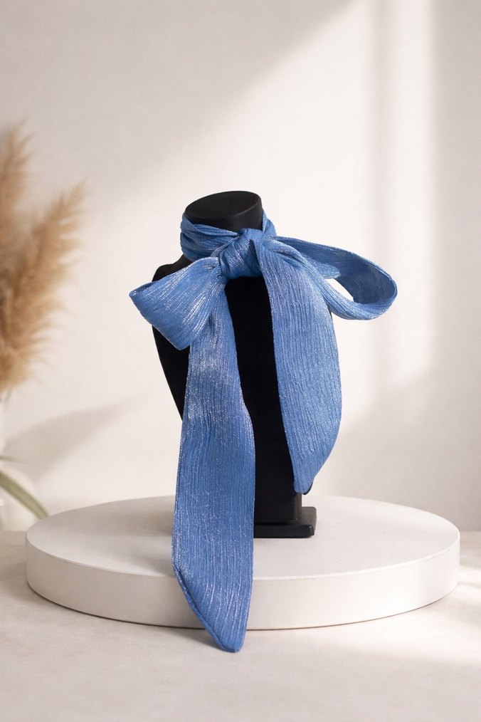 Kadınlar için pileli detaylara ve ipeksi dokunuşa sahip parlak mavi tonunda, Paris esintili çağdaş ve şık fular.