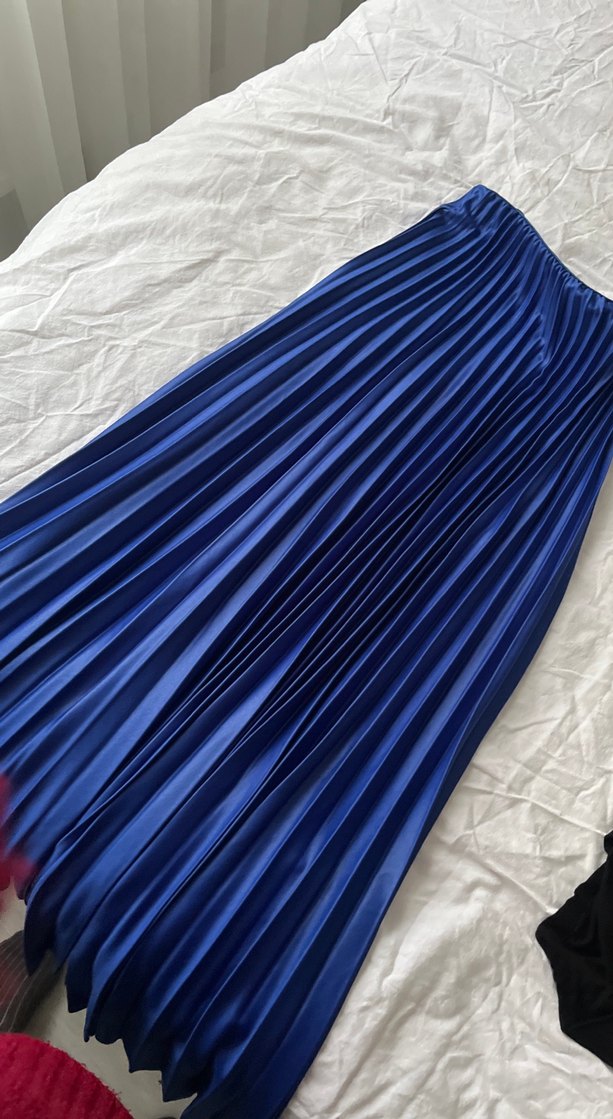 Parlak mavi pilili sentetik kumaştan yapılmış, fit kesim uzun etek. Bohem ve Paris tarzıyla parti için uygun.