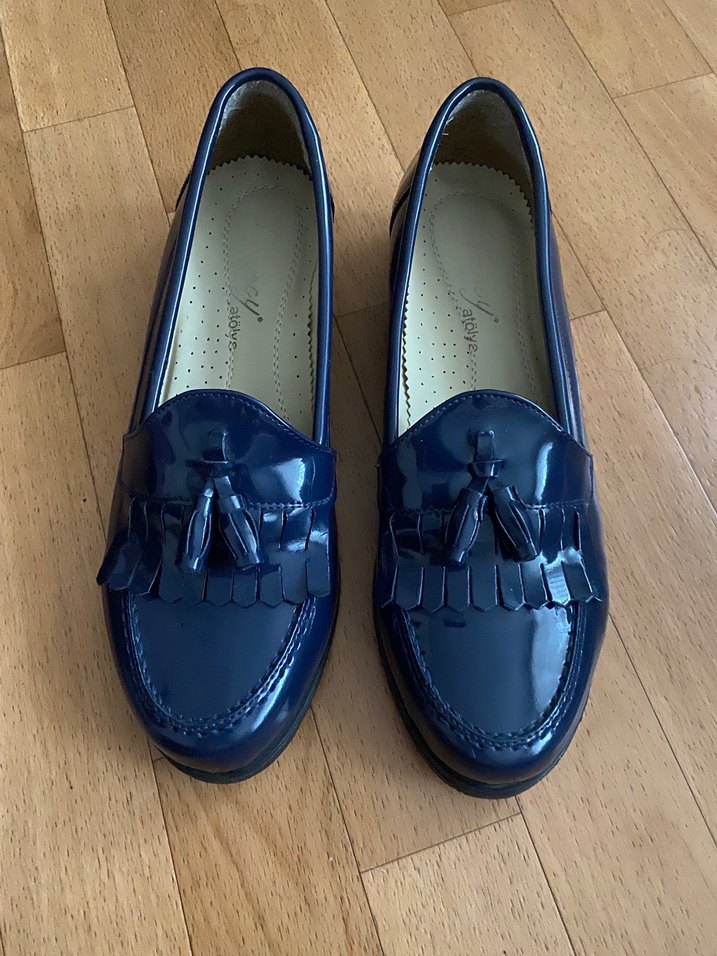 Parlak mavi renkte, püsküllü ve konvansiyonel stilde, dayanıklı alçak tabanlı Oxford ayakkabısı.