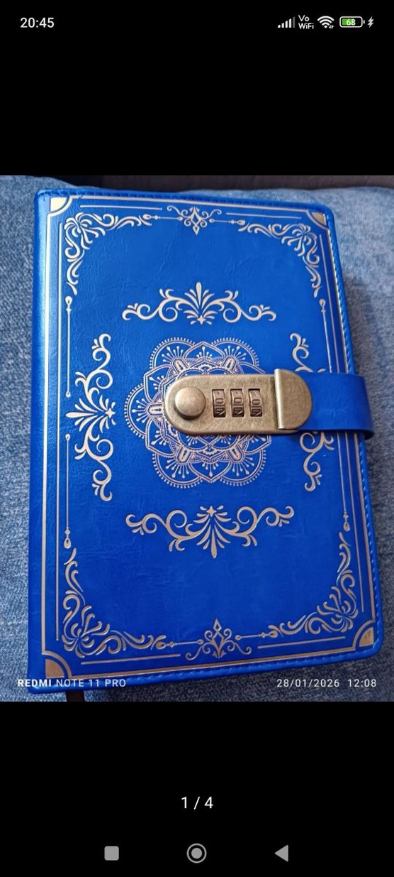 Parlak mavi kapaklı, karmaşık gümüş desenlere sahip ve şifreli kilitli defter.