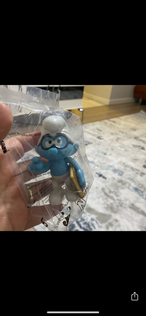 Parlak mavi renkte, beyaz şapka ve pantolonlu figür, küçük sarı bir eşya tutuyor. Şeffaf plastik ambalajda.