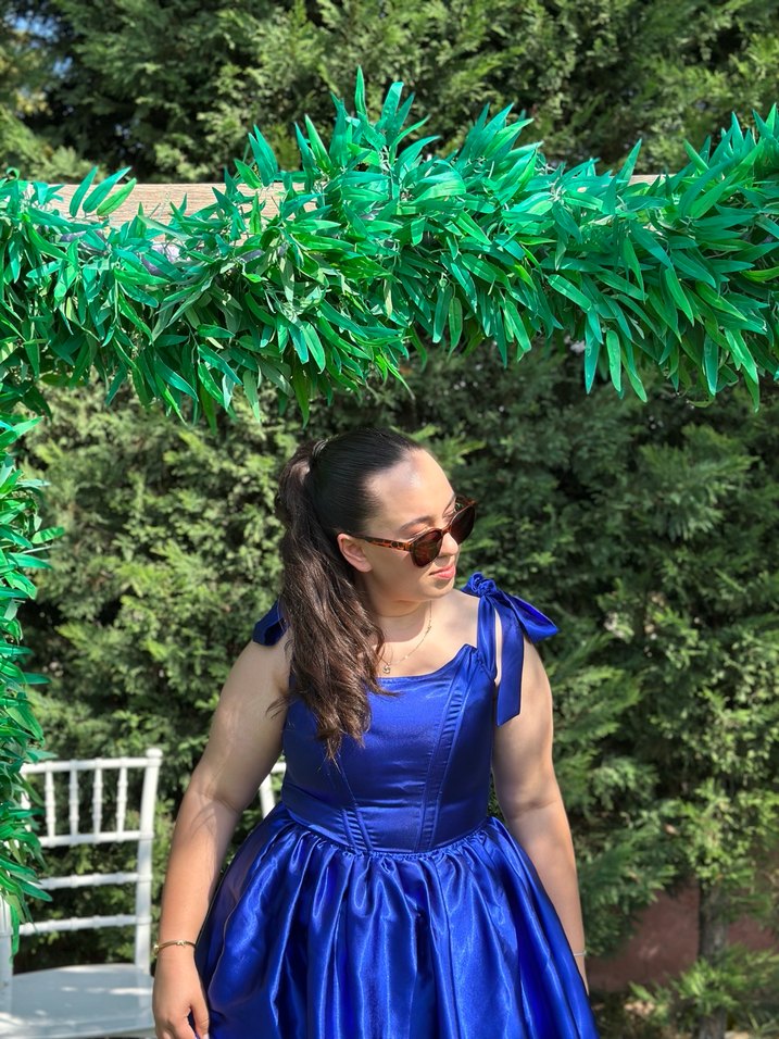 Parlak mavi kumaştan, straplez ve vücuda oturan midi elbise, drapeli detaylarla parti için uygun. Özel olarak dikim yapıldı elbise ben 7000’e diktirdim 5 saat falan kuzenimin düğününde giydim ve bir kere giyildi sıfır gibi