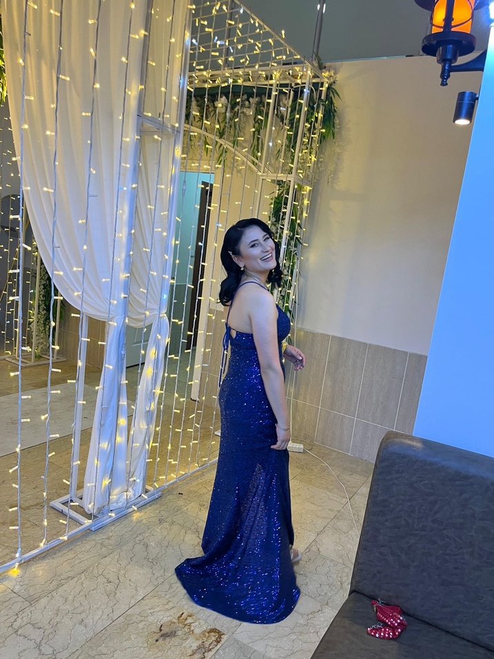 Bu dar kesim, straplez elbise parlak mavi simli ve çağdaş desenlidir, düğünler için uygundur. ✨