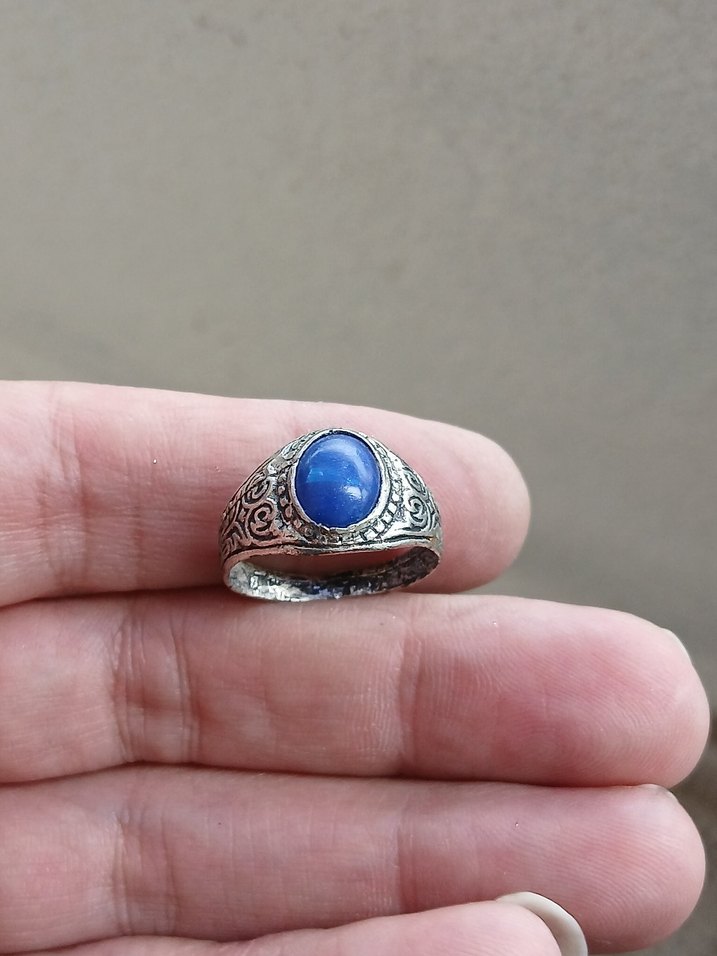 Parlak mavi taşın yer aldığı, detaylı desenli bantlı bu erkek yüzük vintage bohem tarzını yansıtıyor.