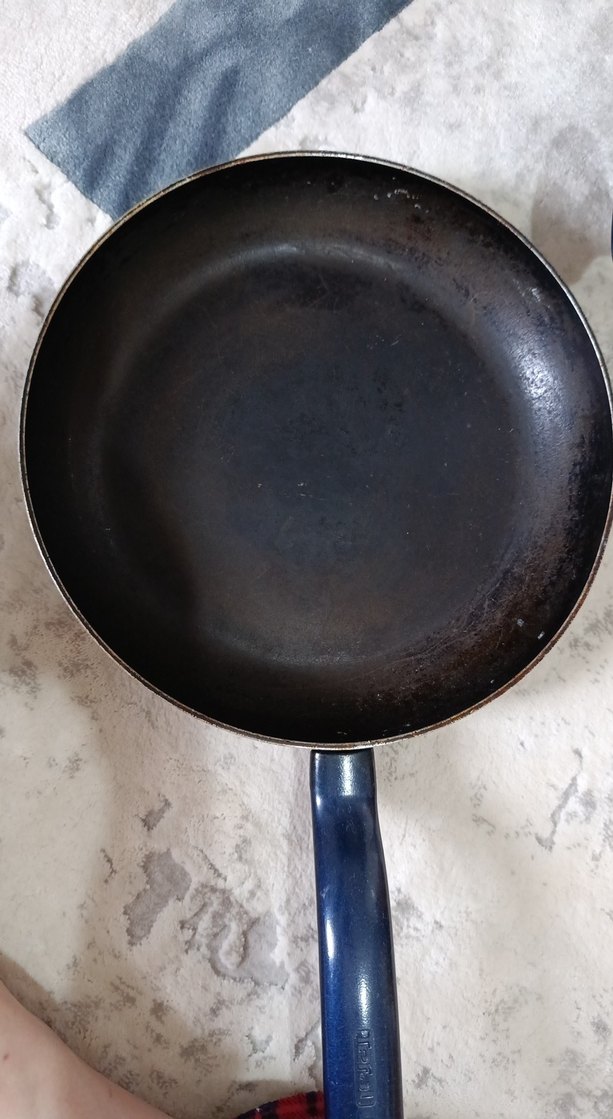 Parlak mavi renkte, pürüzsüz yemek yüzeyine ve sağlam sapına sahip tava.