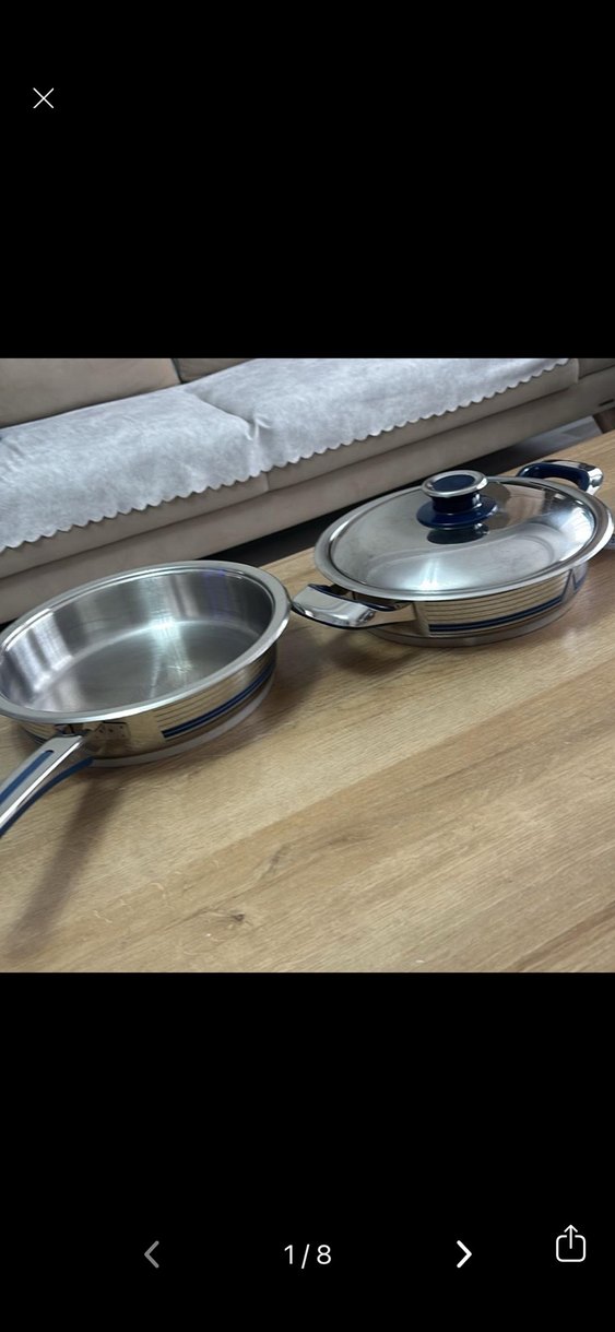 Parlak mavi renkli, saplı tencere ve tava seti. Tencere cam kapaklıdır ve her ikisi de dayanıklı paslanmaz çelikten yapılmıştır.