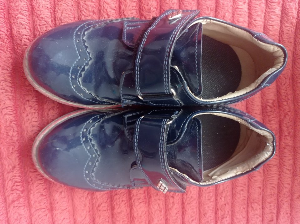 Parlak mavi renkte, tokalı kayışlı, lastik malzemeden yapılmış erkek çocuk özel ayakkabısı. Gotik tarzda, modaya uygun bir model.