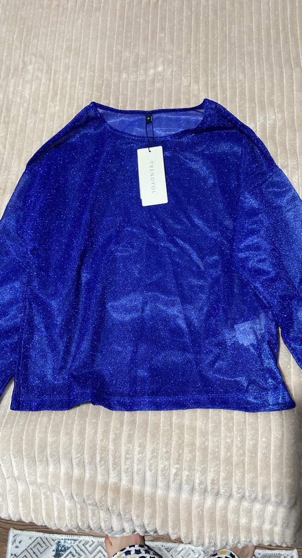 Parlak mavi renkte, triko örme sentetik kumaştan yapılmış, uzun kollu ve yuvarlak yakalı, bol kesim kadın bluz. Orta boy uzunluğu rahat ve şık bir görünüm sağlar. ✨