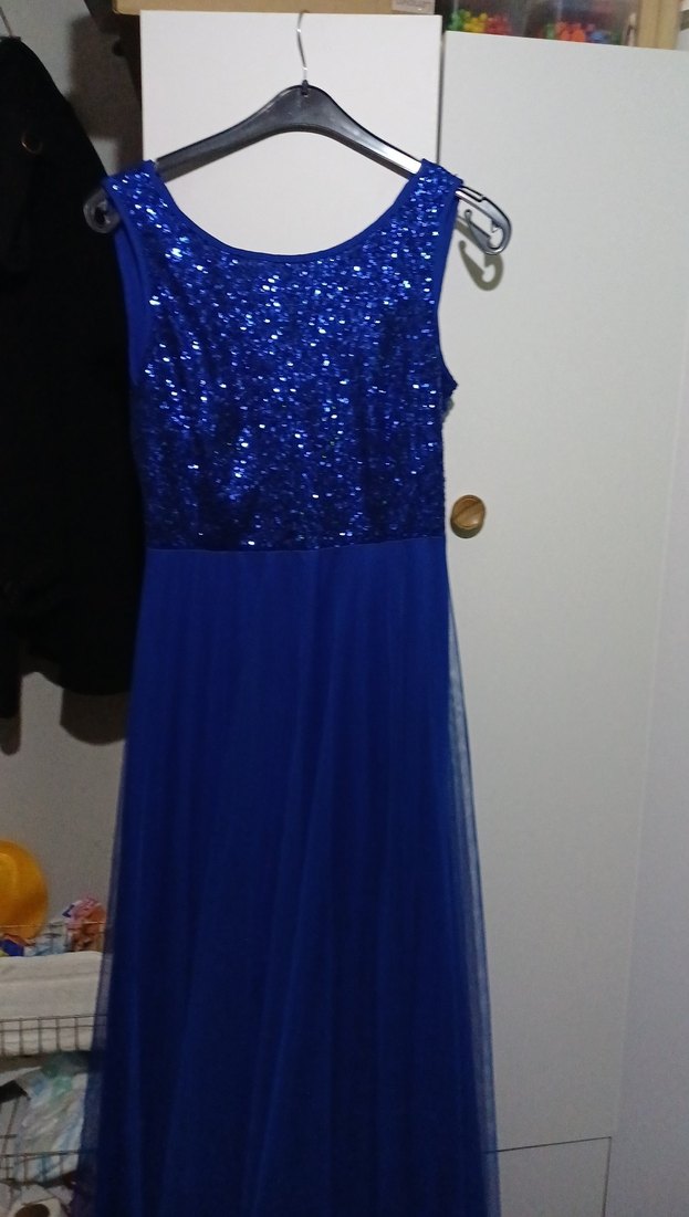 Parlak mavi renkli, üst kısmı simli, kolsuz ve uzun kesim, dar kesim abiye elbise. ✨