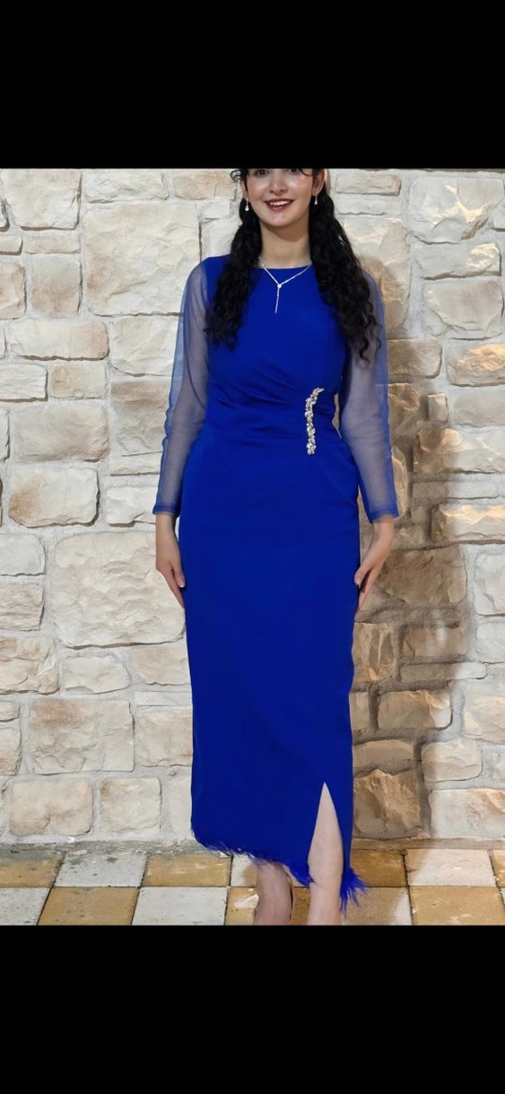 Parlak mavi, uzun tül kollu, drapeli ve broş detaylı abiye elbise. Straplez yaka ve yırtmaçla şık hareket sağlar.