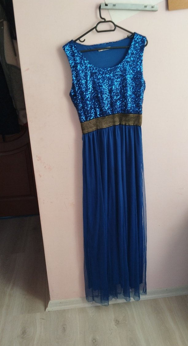 Kolsuz, parlak mavi payetli üst kısmı ve V yakasıyla uzun, drapeli, bele oturan abiye elbise. Altında tül detay ve altın kemer bulunur. Bohem ve şık tarzda, düğün için uygun. ✨