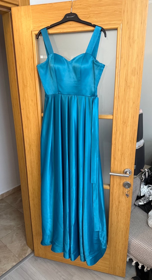 Parlak mavi kumaştan, straplez yaka ve drapeli detaylara sahip uzun, vücuda oturan kadın abiye elbise. ✨38 diyor ama geniş kalip bence 40