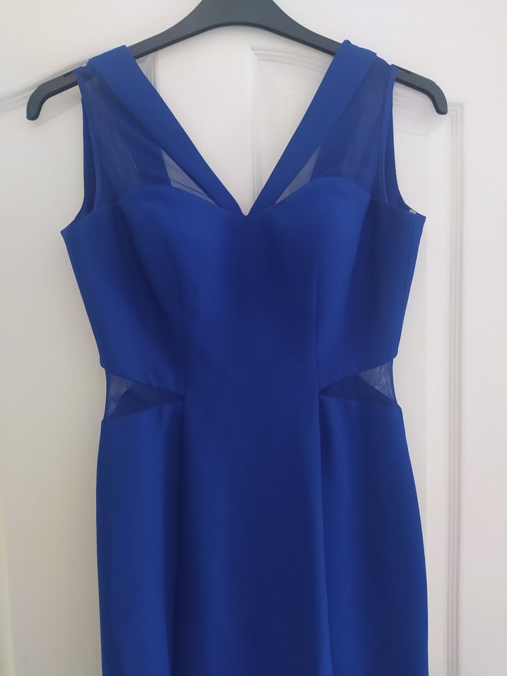 Parlak kumaştan, uzun ve drapeli, kolsuz, tek renk mavi abiye elbise. Tekne yaka ve sıkı kesimiyle çağdaş ve minimal bir tarz sunar. Boy:1.50