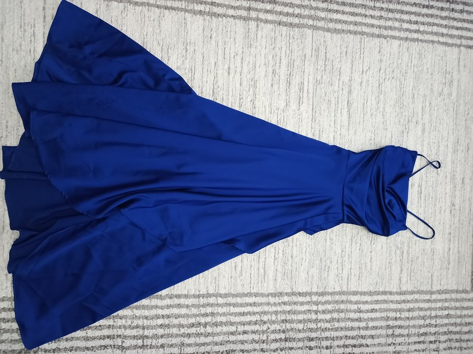 Parlak mavi kumaştan, uzun ve drapeli, tek renk kadın abiye elbise. Kayık yaka ve ince askılı, şık ve modern bir tasarım.