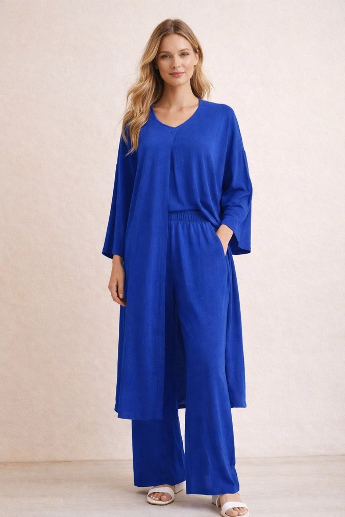 Parlak mavi renkte, uzun kollu ve bol kesim kadın sabahlığı. Minimalist ve çağdaş tarzda rahat kullanım sağlar.