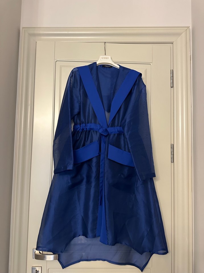 Parlak mavi renkte, uzun kollu ve bol kesim kadın sabahlığı. Uzun boyu ve kemer detaylı açık ön tasarımıyla çağdaş avant-garde tarzı sunar.