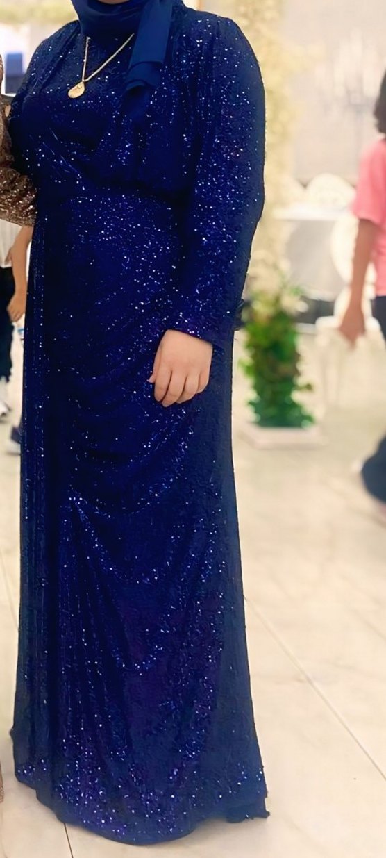 Parlak mavi renkte, uzun kollu ve V yakalı, drapeli uzun abiye elbise. Zarif ve gösterişli, düğünler için uygun sadece birdefa giyildi hicbir sorunu yoktur. ✨