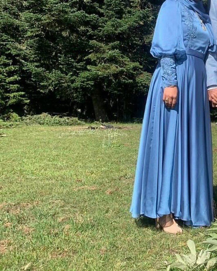 Parlak mavi kumaştan, uzun kollu ve yüksek yakalı, bol kesim kadın abiye elbise. Dökümlü detaylarıyla sade ve tesettür uyumlu.