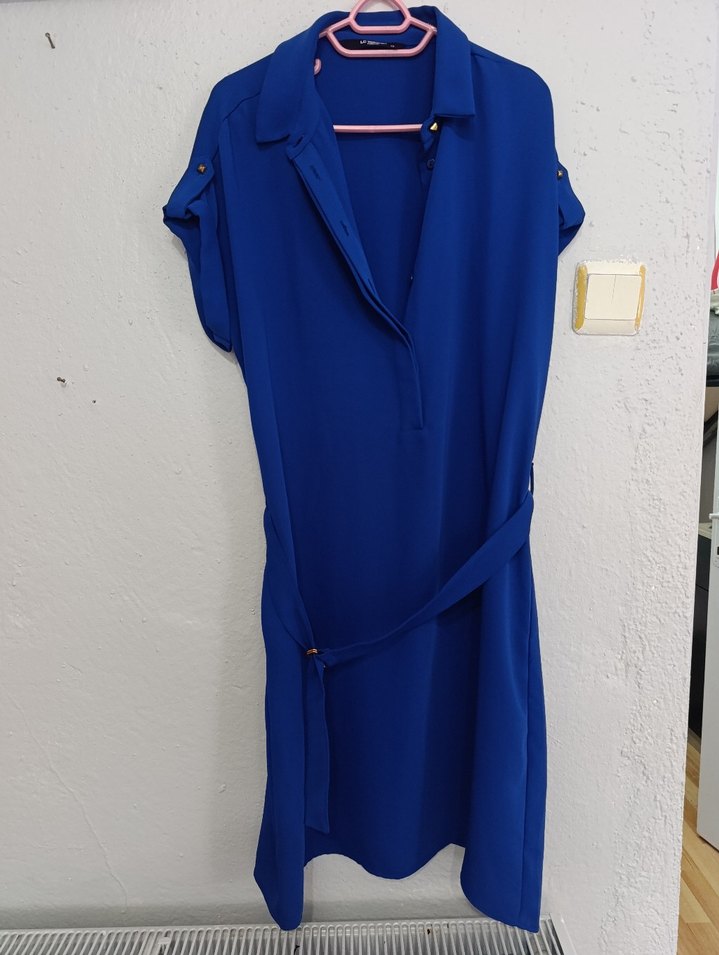 Parlak mavi renkte, uzun ve salaş kesimli kadın elbisesi. Kolsuz tasarımı ve kemeri ile sade ve rahat bir görünüm sunar.