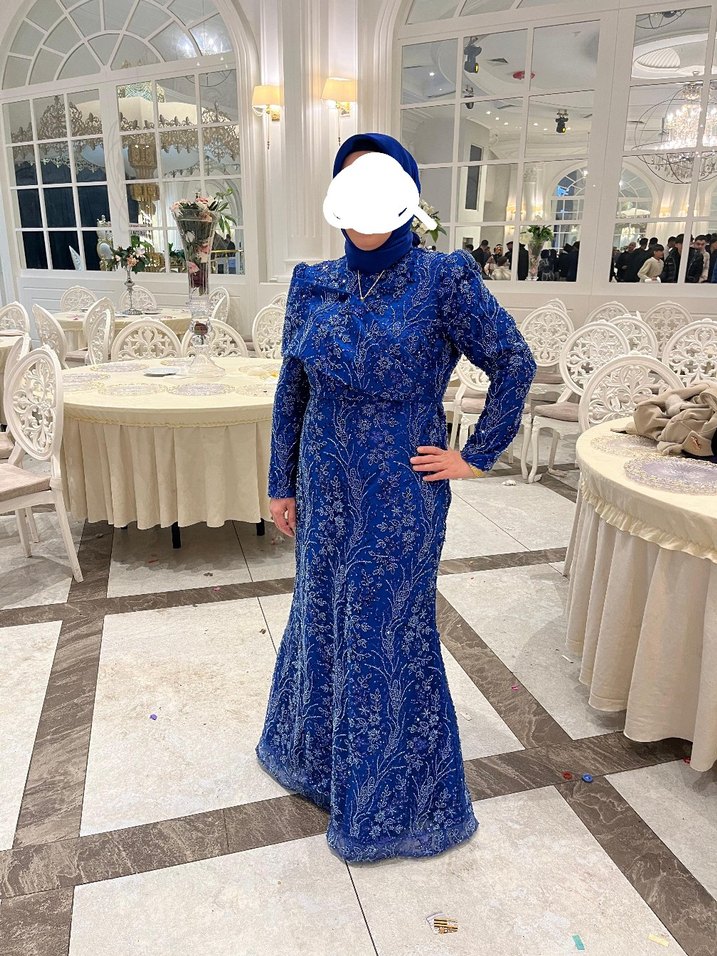 Parlak mavi desenli kumaştan, yüksek yakalı ve uzun kollu drapeli, vücuda oturan uzun abiye elbisedir. . ✨38-44 beden arkası ipli ✨