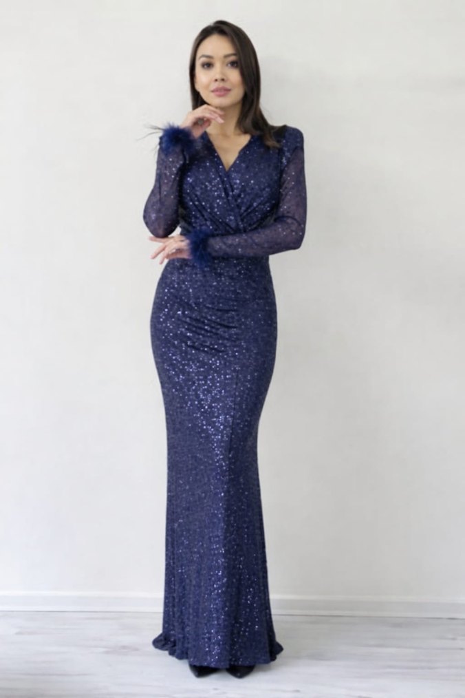 Parlak Mavi Uzun Kollu V Yaka Abiye Elbise
