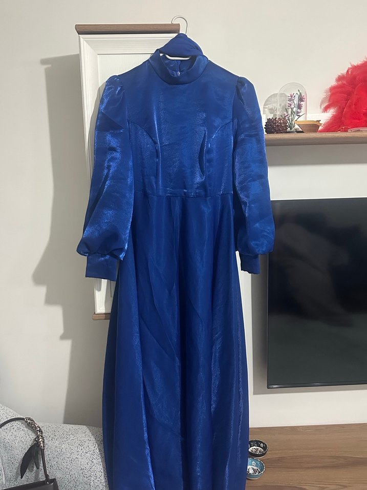 Parlak mavi kumaştan, yüksek yakalı ve uzun kollu, drapeli, vintage gotik tarzında, parti için uygun dar kesim kadın elbisesi.