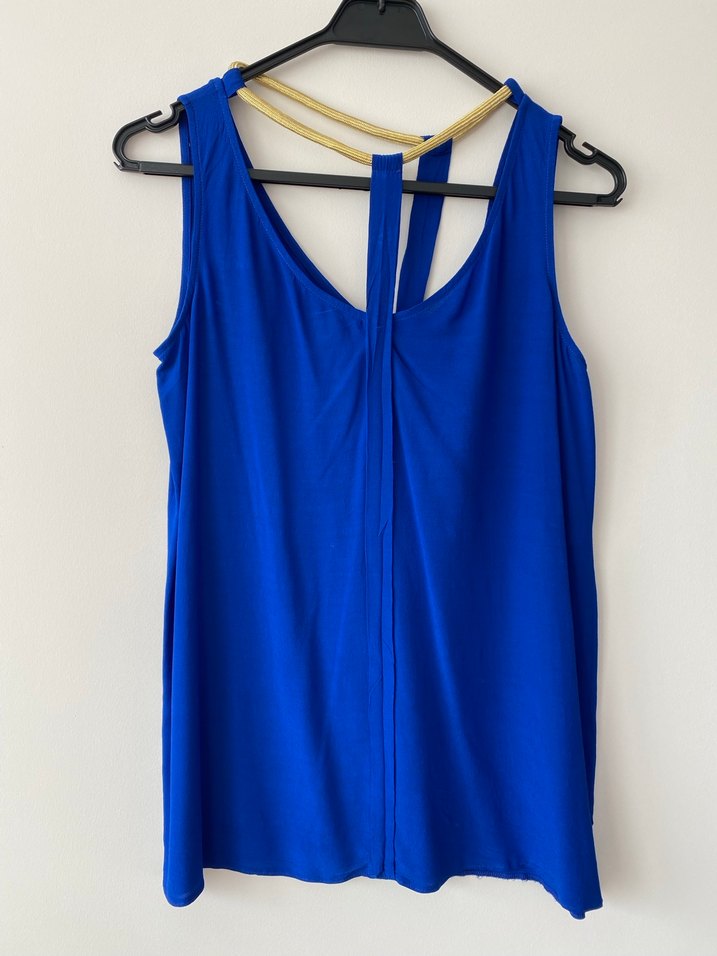 Parlak mavi renkte, V yakalı ve kolsuz bluz. Dökümlü ve bol kesimiyle modern tarzda, günlük kullanıma uygun yumuşak sentetik kumaştan yapılmıştır. Boynerden almıştım fakat etiketini kestim.