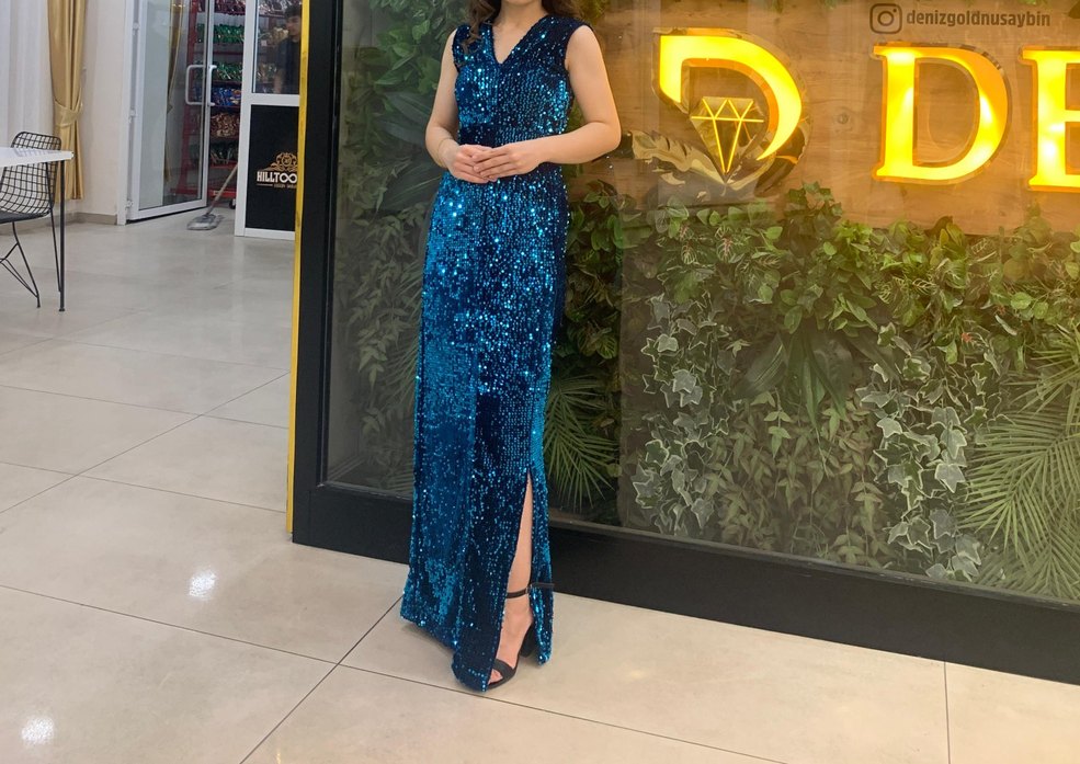 Pulu mavi tie-dye desenli, pul detaylı, V yakalı ve kalın askılı uzun abiye elbise. Yan yırtmaçlı ve vücuda oturan kesime sahiptir. ✨