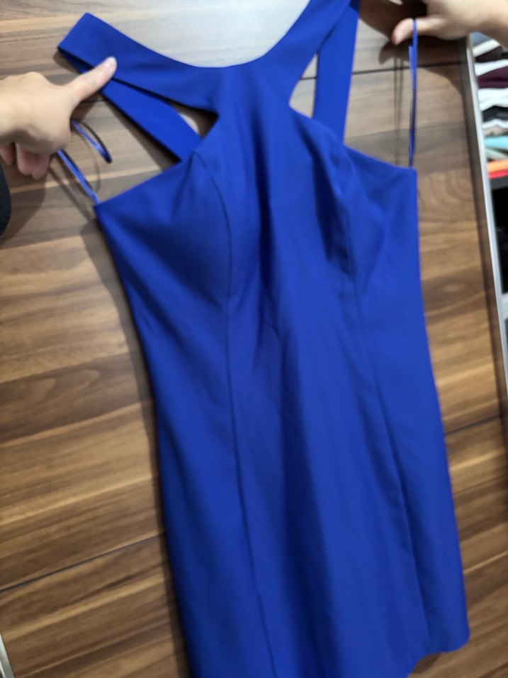 V yakalı, kolsuz ve vücuda oturan bu parlak mavi elbise, yırtmaçlıdır ve minimalist sokak stili sunar, parti için uygundur.