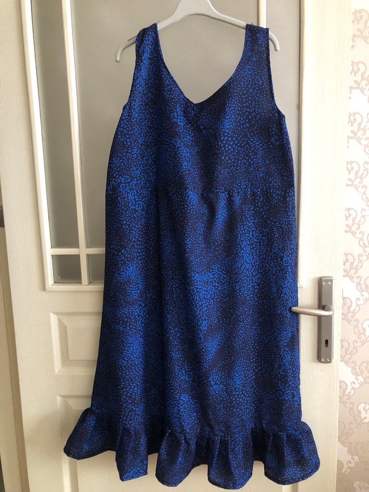 Parlak mavi yılan desenli, kolsuz V yaka, bol kesim ve fırfırlı etek ucu